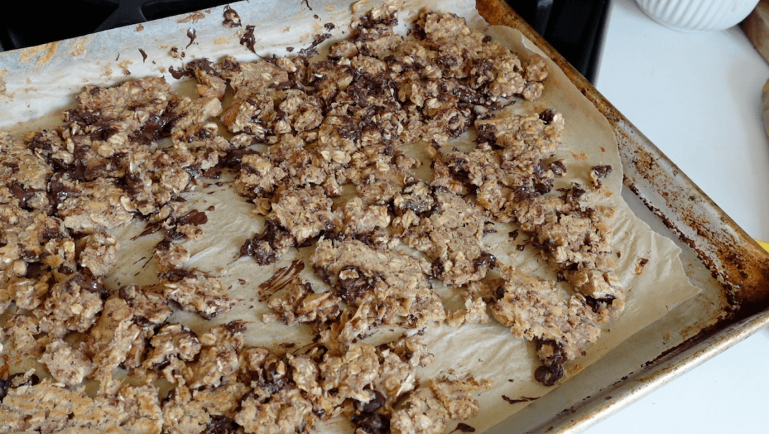 - 3. Spread out on a parchment paper lined baking tray. Use your hands to spread the granola out evenly in one flat layer.