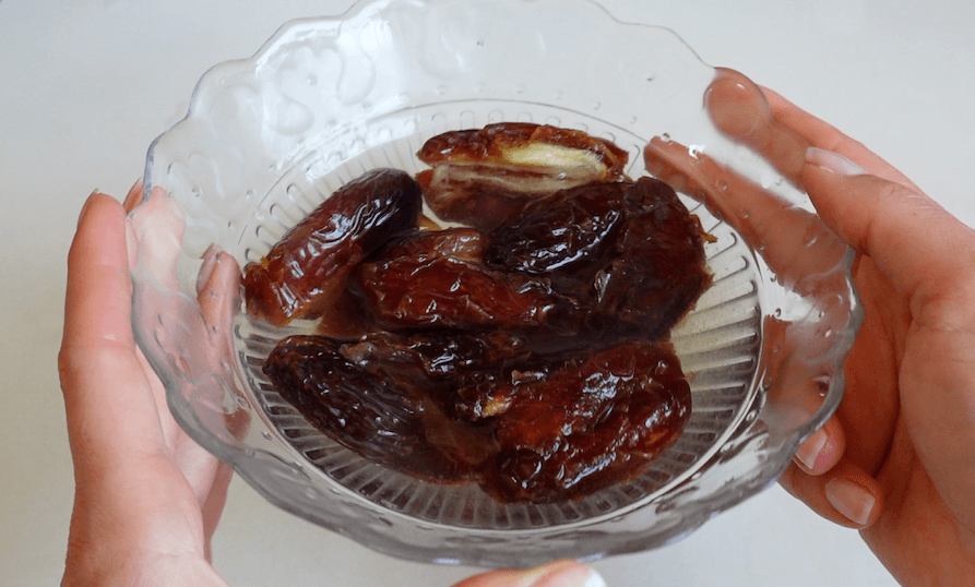 • 1. Bring a kettle of water to a boil. Pour half a cup of hot water over the 10 pitted dates in a heat resistant dish. Soak dates in the hot water for at least 5 minutes (alternatively, add water and dates to a bowl and microwave for 30 seconds, for a quicker option).