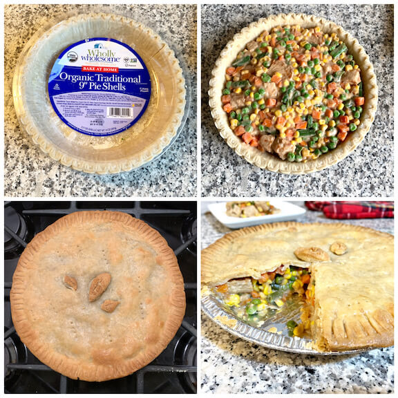 Easiest vegan pot pie using store bought pie crust, vegan chicken, frozen veggies, vegan gravy mix and oat milk.