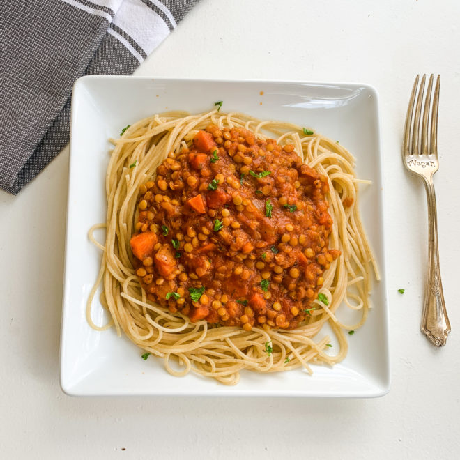 This lentil bolognese spaghetti recipe was originally posted in my “budget recipes with 5 ingredients or less” Youtube video. My goal was to share cheap/ affordable plant based recipes using under 5 ingredients. This lentil bolognese sauce came out soo tasty and only cost $4 for the recipe!