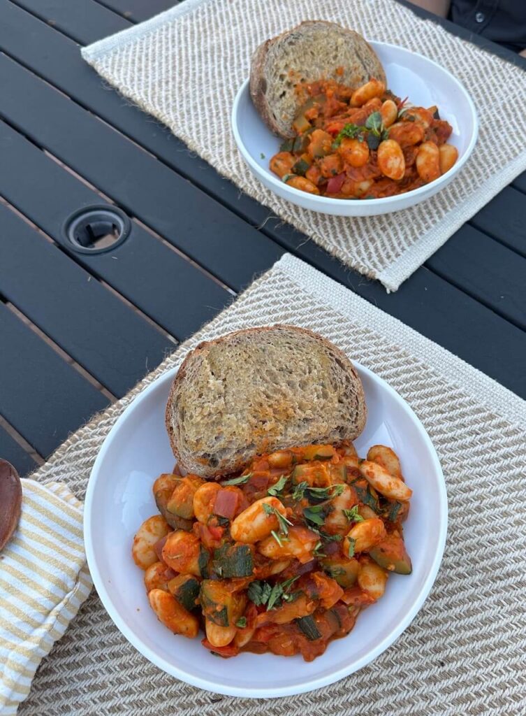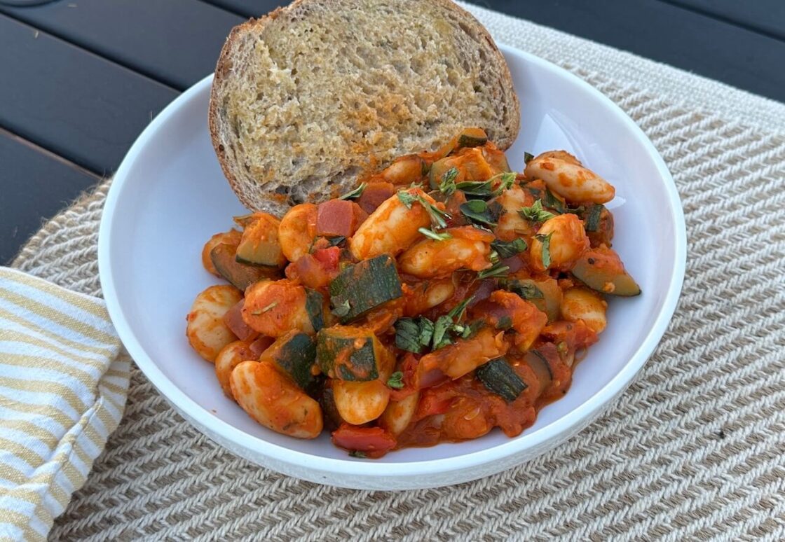 GIANT WHITE BEAN RATAOUILLE using fresh garden produce, homemade fresh tomato sauce and fresh herbs! Greek gigante beans aka giant white beans are added to boost the protein content of this classic dish and keep you full and satisfied!