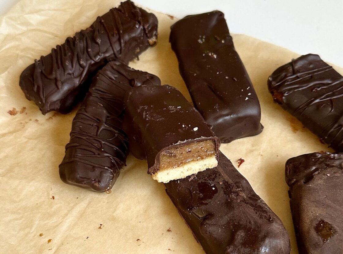 - 6. Dip the shortbread/caramel cookie into the chocolate and use a spoon to cover all sides. Place on a parchment lined plate in the fridge to harden. Once hard, use a knife to cut away any excess chocolate from the sides. Store bars in fridge til ready to eat.
