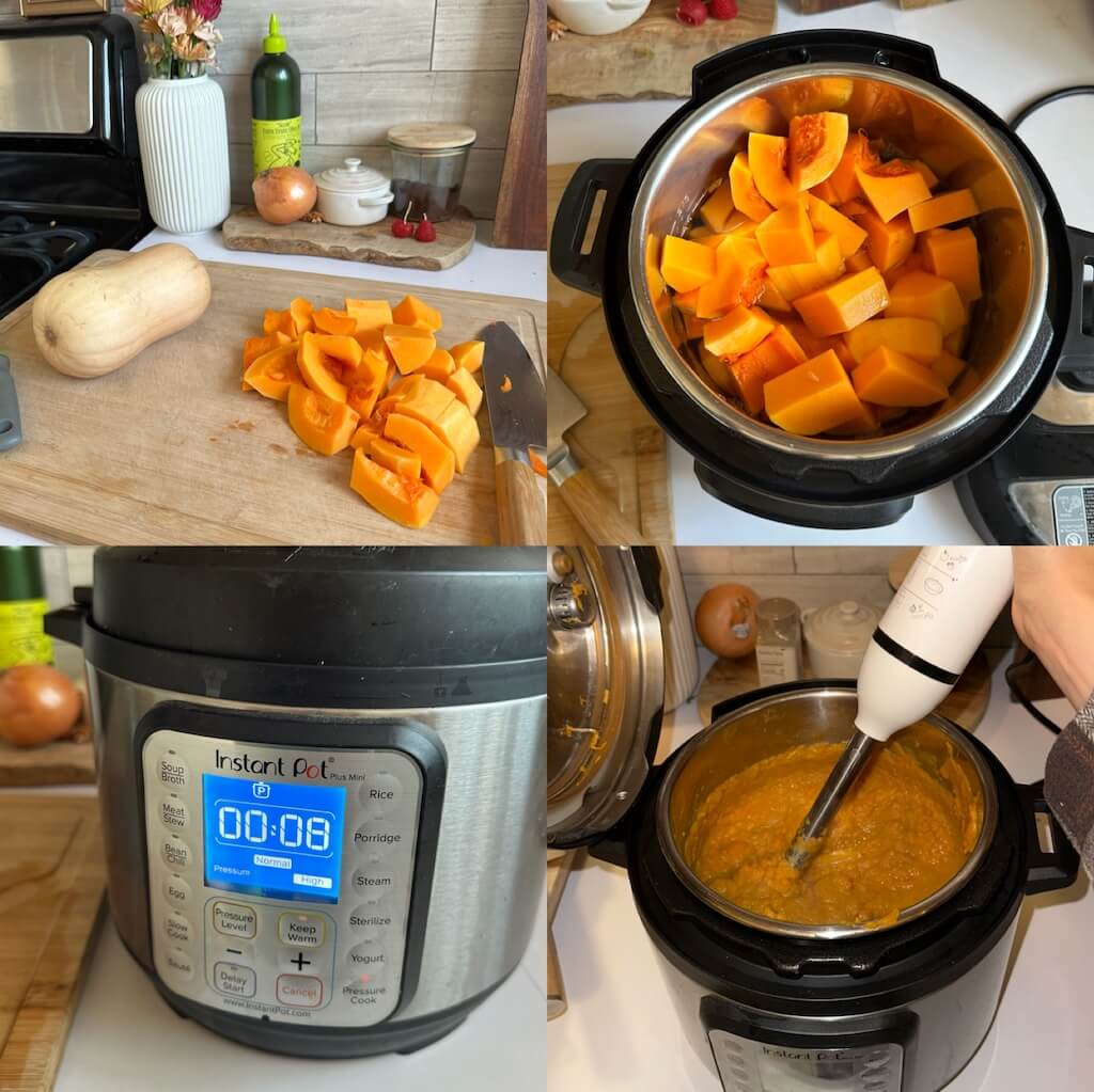 - 1. Peel, remove seeds and chop butternut squash. For sweeter and more flavorful result look for honeynut squash (looks like a mini butternut) I like to do 1 medium sized butternut plus 2 or 3 smaller honeynut. Tastes like pie filling! Add peeled and chopped squash to Instant Pot lined with a steamer rack. Add 2 cups of water to the bottom. Pressure cook for 8 minutes. Natural release for about 15 minutes then release any remaining pressure manually. For stove top option- place a steam rack in a large soup pot with 2 cups of water in the pot. Add chopped butternut squash. Cook until soft, about 15 minutes. Drain water and add squash back to the pot.