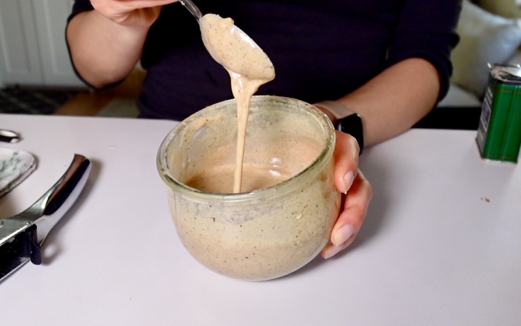This everyday dressing has a garlicky savory taste with a hint of lemon and dijon. This recipe is written as using raw almond butter but you can sub any nut butter like tahini or cashew butter. The nut butter is what makes this dressing super easy to shake up, when you mix nut butter with water it turns into a thick cream- no blender required.