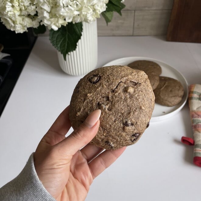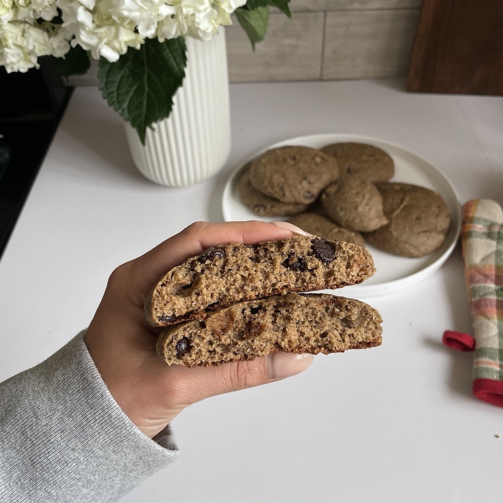 Chocolate chip muffin top cookies made with no oil, refined sugar, eggs or dairy! I was on a mission to make tasty oil and sugar free chocolate chip cookies and I created these soft pillowy muffin cookies! They are soft like a muffin but baked on a sheet pan like cookies! They come together super quick and easily and they have become a staple in my house when we need a sweet treat!
