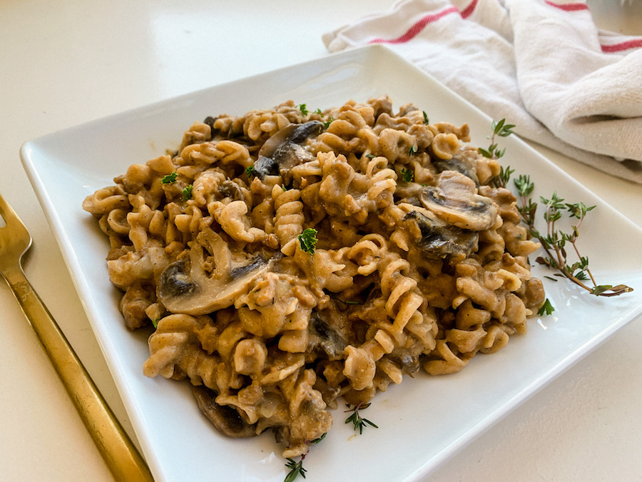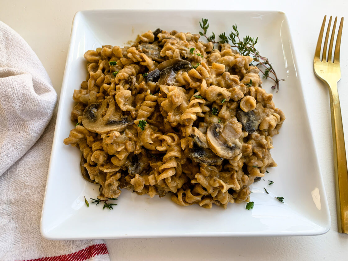 I am a huge proponent of one pot recipes because I like to do as few dishes at the end of the night as possible! Not only is this vegan one pot stroganoff recipe easy to make, but it is also flavorful, savory, creamy and beefy! This recipe is loaded with mushrooms which are super healthy and have been shown to boost immune function. I like to use whole wheat pasta for added fiber. The sauce is ultra creamy with the addition of cashew butter stirred in at the end. I use store bought vegan beef crumbles to give this recipe a beefy texture and add some additional plant based protein to the dish. It is one of my boyfriend and my favorites recipes so I hope you enjoy!