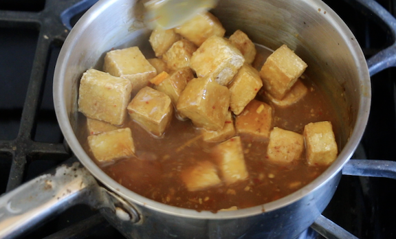 - In a sauce pan combine all of the ingredients for the orange sauce over medium heat EXCEPT FOR the cornstarch and water. Let the sauce simmer for 5 minutes. In a separate bowl mix together the cornstarch and water to make the cornstarch slurry. Pour in the cornstarch slurry to the sauce and stir well for 5 more minutes. Turn off the heat and add the tofu to the sauce and mix well to coat it. Serve while hot with brown rice or quinoa