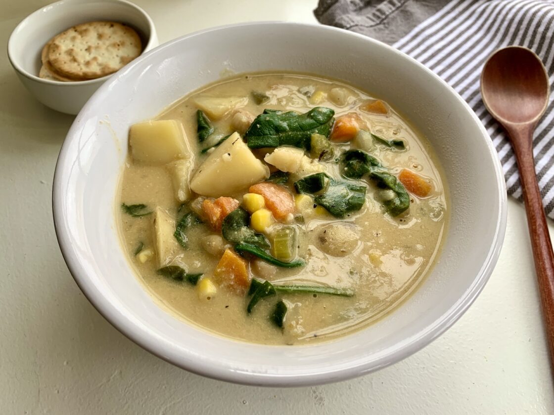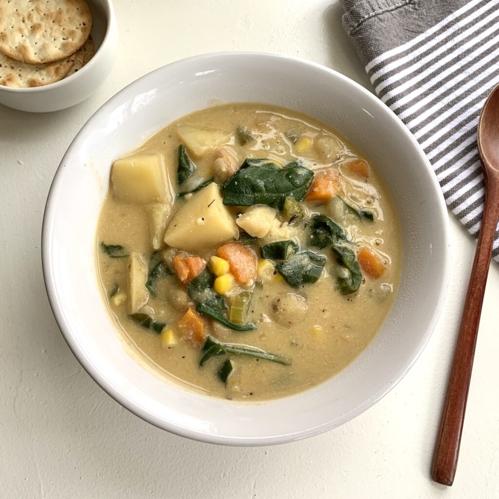 This healthy plant based recipe for potato white bean chowder is hearty, comforting and loaded with veggies! It is so easy to make in the instant pot but can also be made on the stove top in a big soup pot. If you have been following me on youtube for a while you probably already know Instant Pot soups are my all time favorite, go- to meals! I love that you can put a ton of veggies in them and they are so easy to make.
