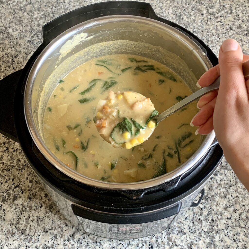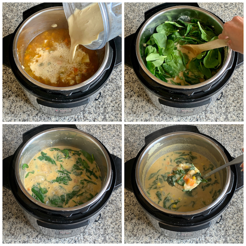 - 5. Put the Instant Pot back on "sauté" add in the corn and spinach and stir. Let it simmer for a few minutes until the spinach is wilted. Once its wilted press "cancel" to turn off the Instant Pot. Season with more salt and pepper to taste and serve.