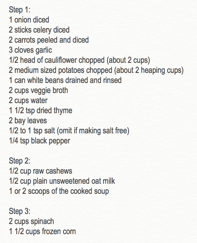 - 4. In a blender add the cashews and plant milk and 2 scoops of the soup with the broth. Blend on high for 30 seconds until the cashews are completely smooth. Add the cashews mixture back to the pot and stir.