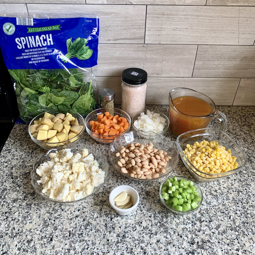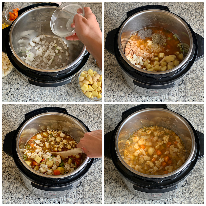 Start out by sautéing your onion in the Instant Pot. Splash in water as needed to prevent burning. Next add in the celery, carrot, garlic, cauliflower, white beans, veggie broth, thyme, salt and pepper, bay leaf and water and stir. Put on the lid, set the valve to sealing, and pressure cook on “manual” for 5 minutes. When its done do a natural release for 10 minutes, then release the rest of the pressure manually. Take off the lid and stir. Put the IP back on sauté mode.