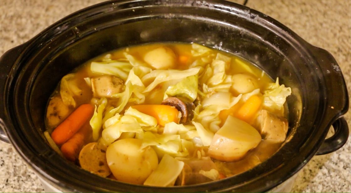 Growing up my family used to eat something called a New England boiled dinner all the time. The recipe used ham, potatoes, carrots, cabbage and turnips. My dad would cook it all day long on Sundays and it would make the whole house smell amazing. I wanted to make a vegan version of that classic meal so I came up with this slow cooker recipe! In place of ham I used vegan sausages from the brand Tofurkey. They are really salty which adds a lot of flavor to the vegetables. For veggies I used potatoes, onion, carrots and cabbage. This recipe came out so flavorful, I will definitely be making it any time I am in the mood for a classic nostalgia comfort meal!