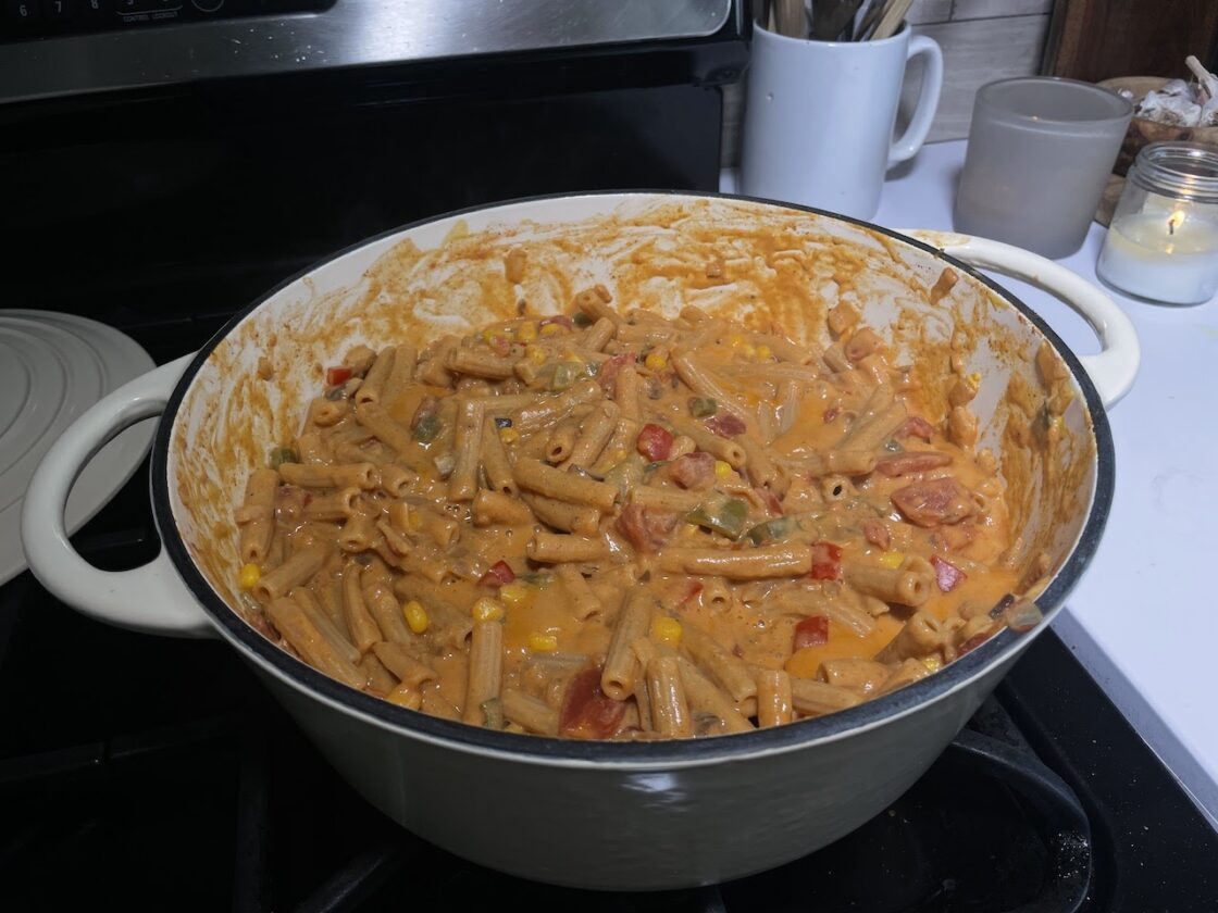 - Combine the pasta, tomato/bell pepper mixture and nacho sauce all together and stir. Top with green onion, avocado and/ or vegan cheese to serve!