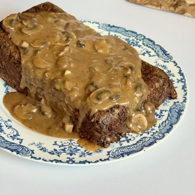 Lentil loaf with mushroom gravy made without eggs, dairy or gluten! This lentil loaf firms up beautifully in the oven and is loaded with hearty veggies, mushrooms and fiber rich lentils. I use a food processor to chop the veggies into tiny dices which helps makes prep a breeze. This recipe plus the gravy is a bit of a process but dont get overwhelmed! I will break it down into a few basic steps: