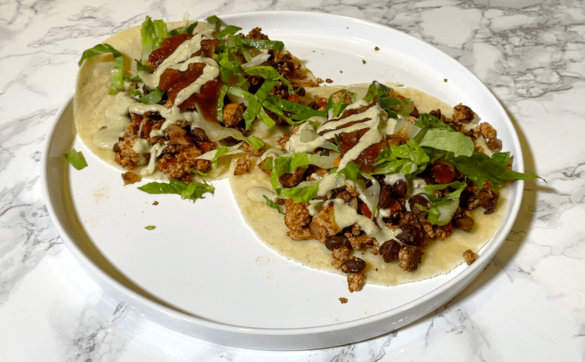 - 4. Spread mixture out on 2 baking sheets lined with parchment paper. Bake at 350 degrees for 20 mins, flip and bake another 10- 20 minutes depending on how wet the mixture is. I usually do 40 minutes total. Serve as tacos, burritos, in a burrito bowl or salad.