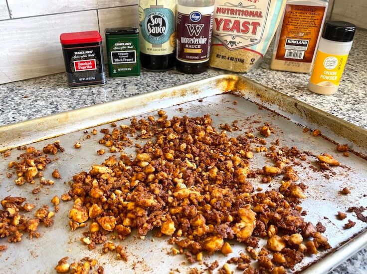 Tofu crumbled up with spices and baked in the oven to make vegan ground taco meat