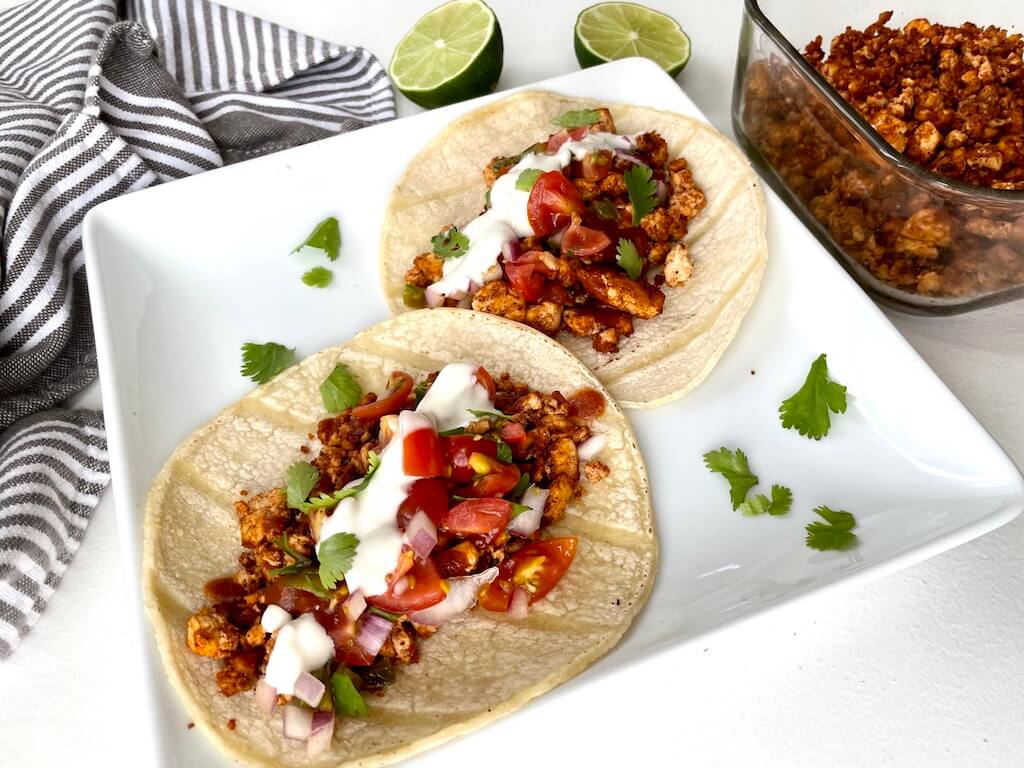- 4. Spread out the tofu crumbles evenly onto a baking sheet lined with parchment paper or oil. Bake in the oven for 20 minutes, then take it out and flip it over and bake for another 10 minutes. If it gets too crispy and hard then take it out sooner. Serve as filling for tacos, enchiladas, quesadillas, taquitos or on a salad. Use my easy vegan sour cream as a topping.